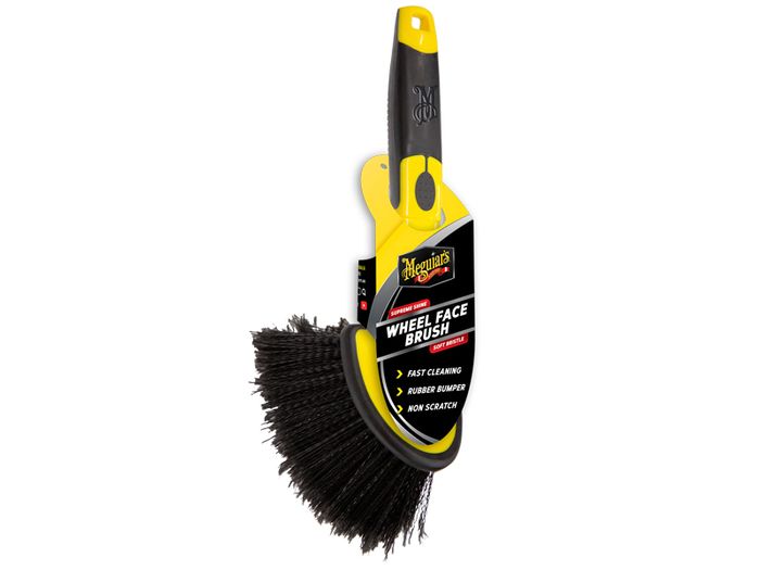 Cleaning your wheels by agitating with the Meguiar’s Wheel Face Brush provides a deeper more thorough clean. It’s soft, feathered bristles makes wheel cleaning quicker and easier than ever – all without scratching and all while using a lot less wheel cleaning product. The broad brush head packed with long, thick bristles makes short work of even the largest wheels, while also being able to reach down into tight spaces – like around the lug nut holes. Protective rubberized bumper stops the brush from banging against your wheel’s sensitive edges. This professional-grade brush provides unmatched cleaning action and features an ergonomic design with a premium, rubber-grip handle. Perfect for use on all styles of wheels and with all types of wheel cleaners – including colour activating formulas. Designed to be used in conjunction with the Meguiar’s Universal Wheel Brush