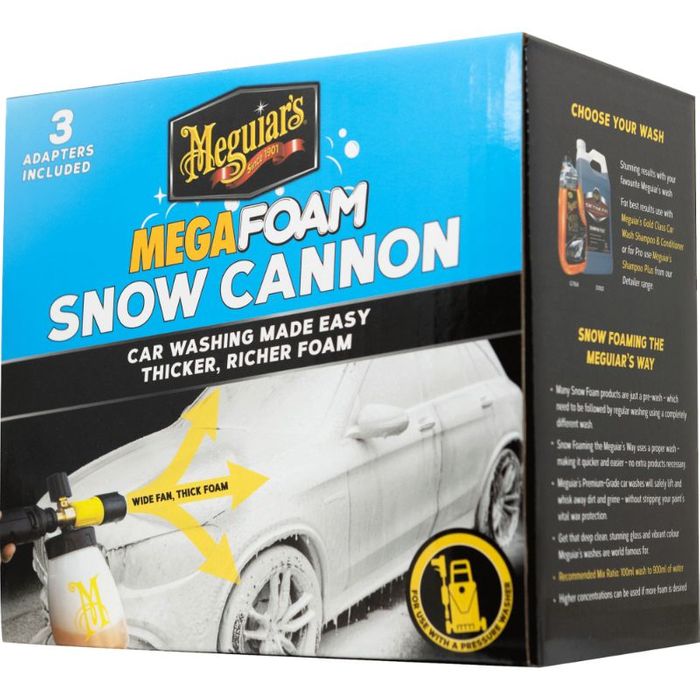 The Meguiar’s Megafoam Snow Cannon delivers extreme foaming action. The thicker, denser foam provides superior cling and greater dwell time for a deeper more thorough clean. Large, high-flow nozzle features adjustable spray pattern that maintains extra-thick, extra rich foam – even at extra-wide fan settings. Stable, anti-topple, 1-litre bottle sports a wide mouth for ease of filling. For best results, combine with a 1400 to 3200psi pressure washer and Meguiar’s Gold Class Car Wash Shampoo & Conditioner, or Meguiar’s Shampoo Plus. Unlike many foaming products that are just expensive pre-washes that need to be followed by a completely different wash product – these high-sudsing, premium-quality car washes deliver the thorough clean, stunning gloss and vibrant colour that Meguiar’s is world famous for. They gently lift and whisk away road grime and contaminants, without inducing washing swirls or scratches – and without stripping your vital wax protection! Snow foaming the Meguiar’s way – without the gimmicks – is quicker, easier and safer. Ideal for cleaning: CAR – SUV – 4WD – TRUCK – MOTORBIKE – WATERCRAFT – CARAVAN – & MANY HOUSEHOLD USES